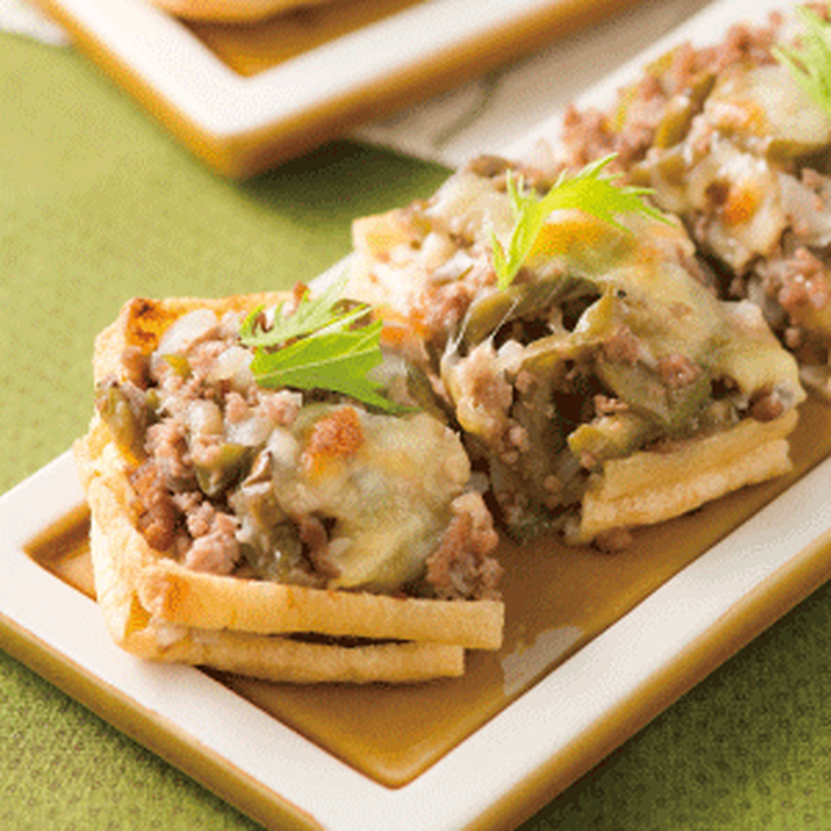 (1)、(2)、チーズを順に2回重ね、オーブントースターでチーズに焼き色がつくまで3~5分焼く。