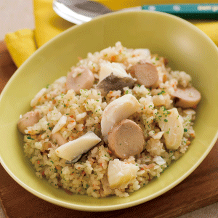炊き上がり後、たらを一旦取り出して骨を外し大きめにほぐして身を戻す。Dと共にひと混ぜし、器に盛る。