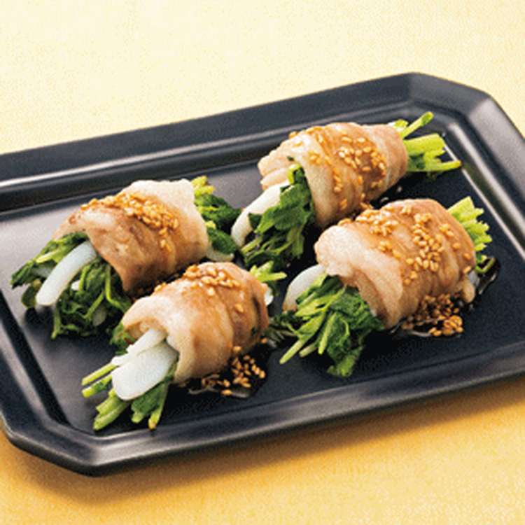 豚肉1枚を広げ、適量のAをのせて巻いたら巻き終わりを下にして耐熱容器に並べる。