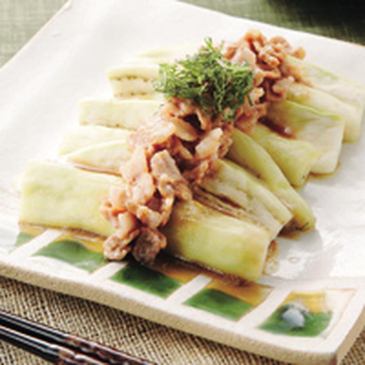 蒸しなすの豚バラわさびソースがけ