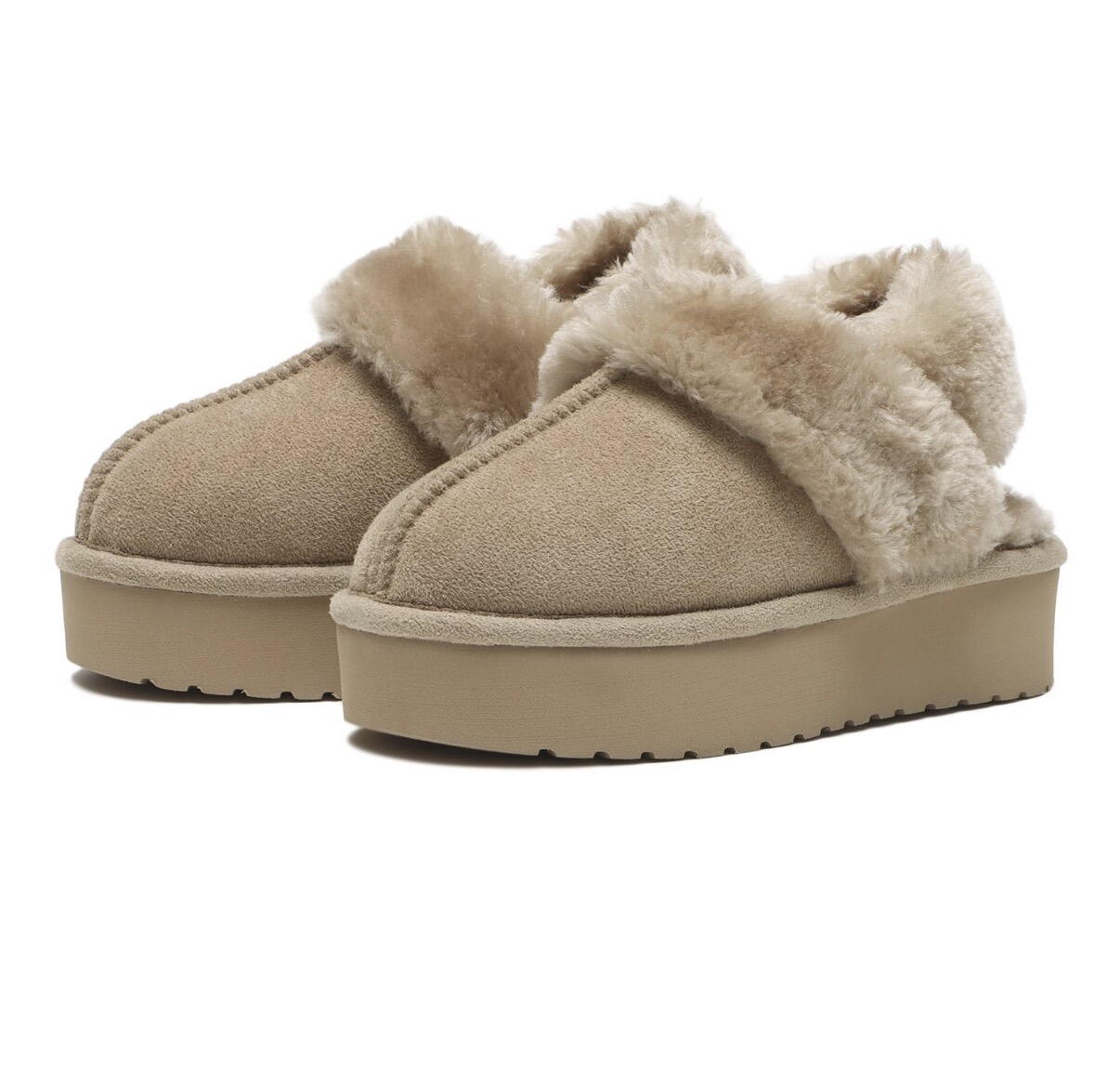 トレンドのムートン風素材を使用した、ストラップ付ミュールデザイン☆