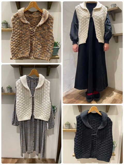 ロービング糸でざっくり編み上げたナチュラルな風合いの『ロービングニットへちま襟ベスト』です♪♪
