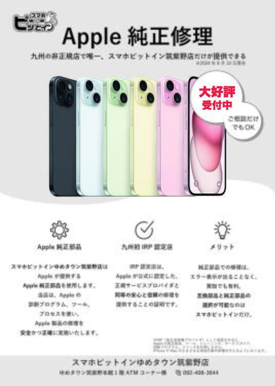 スマホピットインゆめタウン筑紫野店は、地域修理実績No.1を誇る信頼の修理専門店です。Apple認定の独立系修理プロバイダ(IRP)として、Apple純正部品を使用した高品質な修理を提供しており、iPhoneやiPadはもちろん、スマートフォン全般やNintendo Switchの修理にも対応しています。