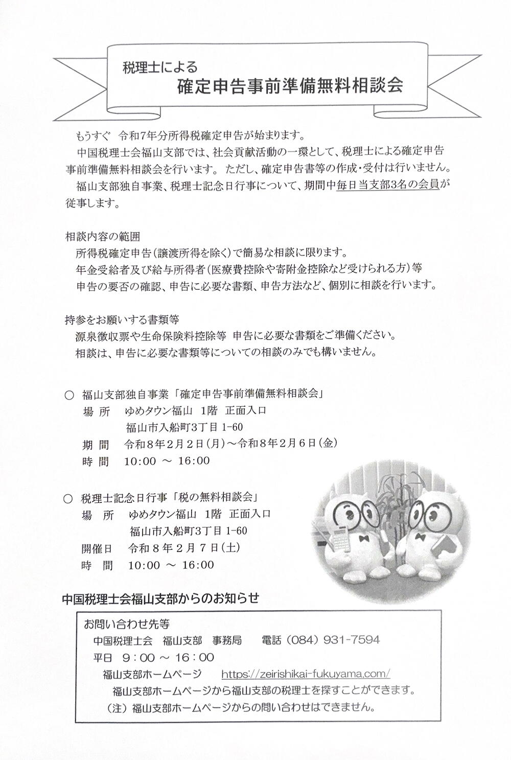 中国税理士会福山支部では、社会貢献活動として無料相談会を開催します。