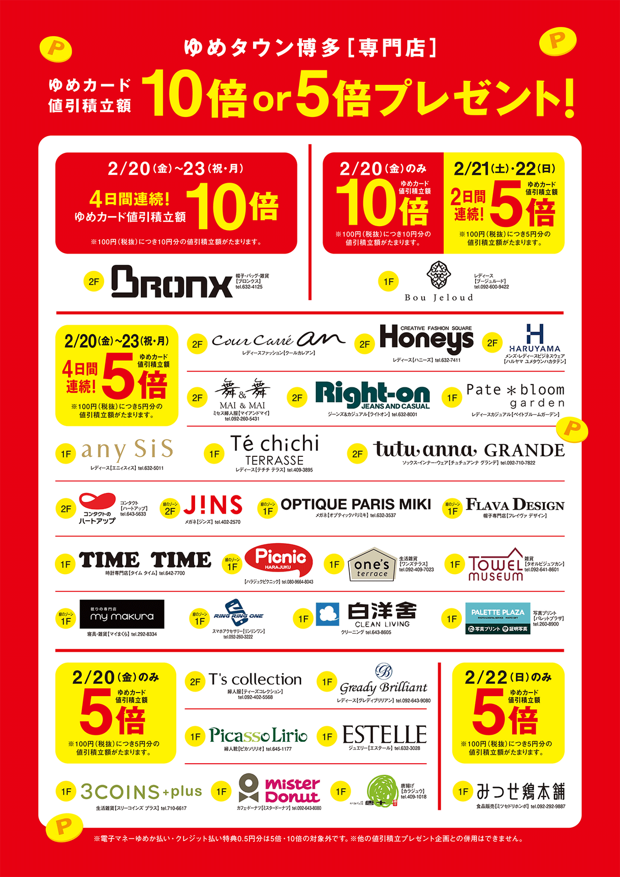 ゆめタウン博多 イベント/キャンペーン ★2/20(金)~2/23(祝・月) [専門店] ゆめカード値引積立額プレゼント