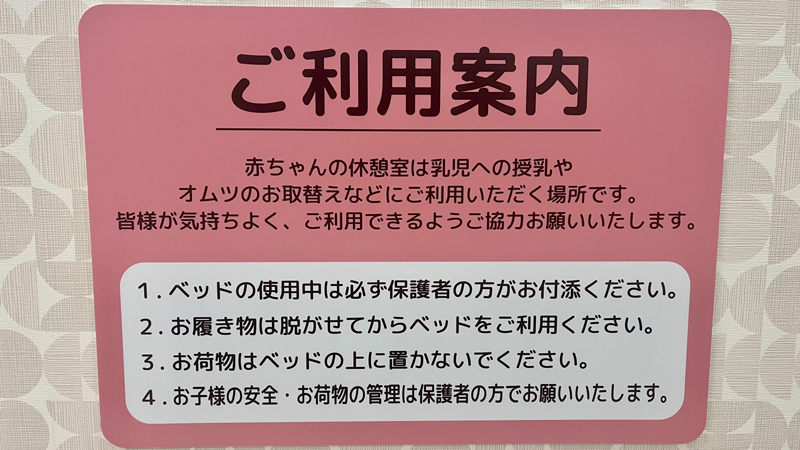 赤ちゃんの休憩室は乳児への授乳やオムツのお取替えなどにご利用いただく場所です。皆様が気持ちよく、ご利用できるようご協力をお願いいたします。