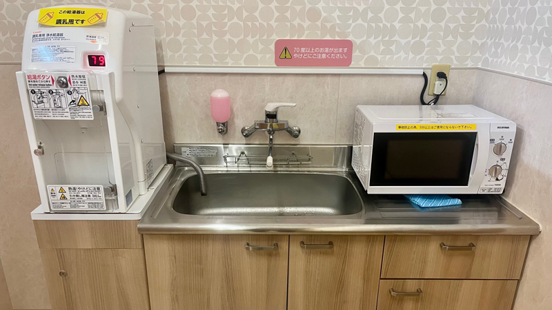 調乳専用浄水給湯器・シンク・電子レンジ・ゴミ箱を設置しています。
