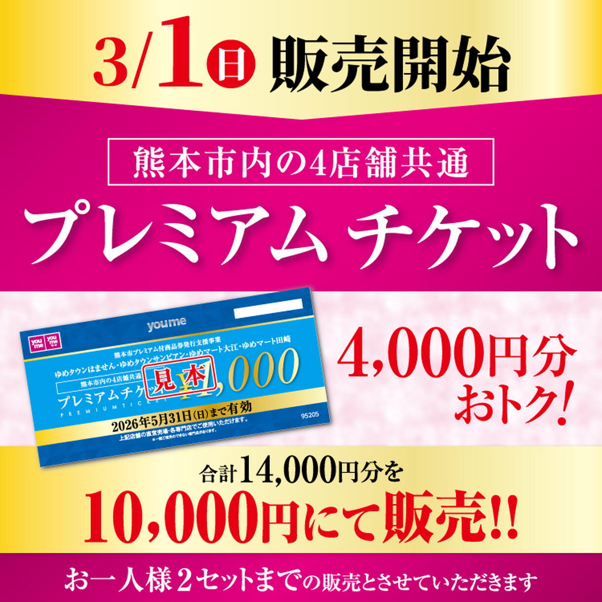熊本市内のゆめタウン・ゆめマート対象4店舗の直営売場と対象専門店で使えるプレミアムチケット14,000円分のセットを10,000円で販売します。