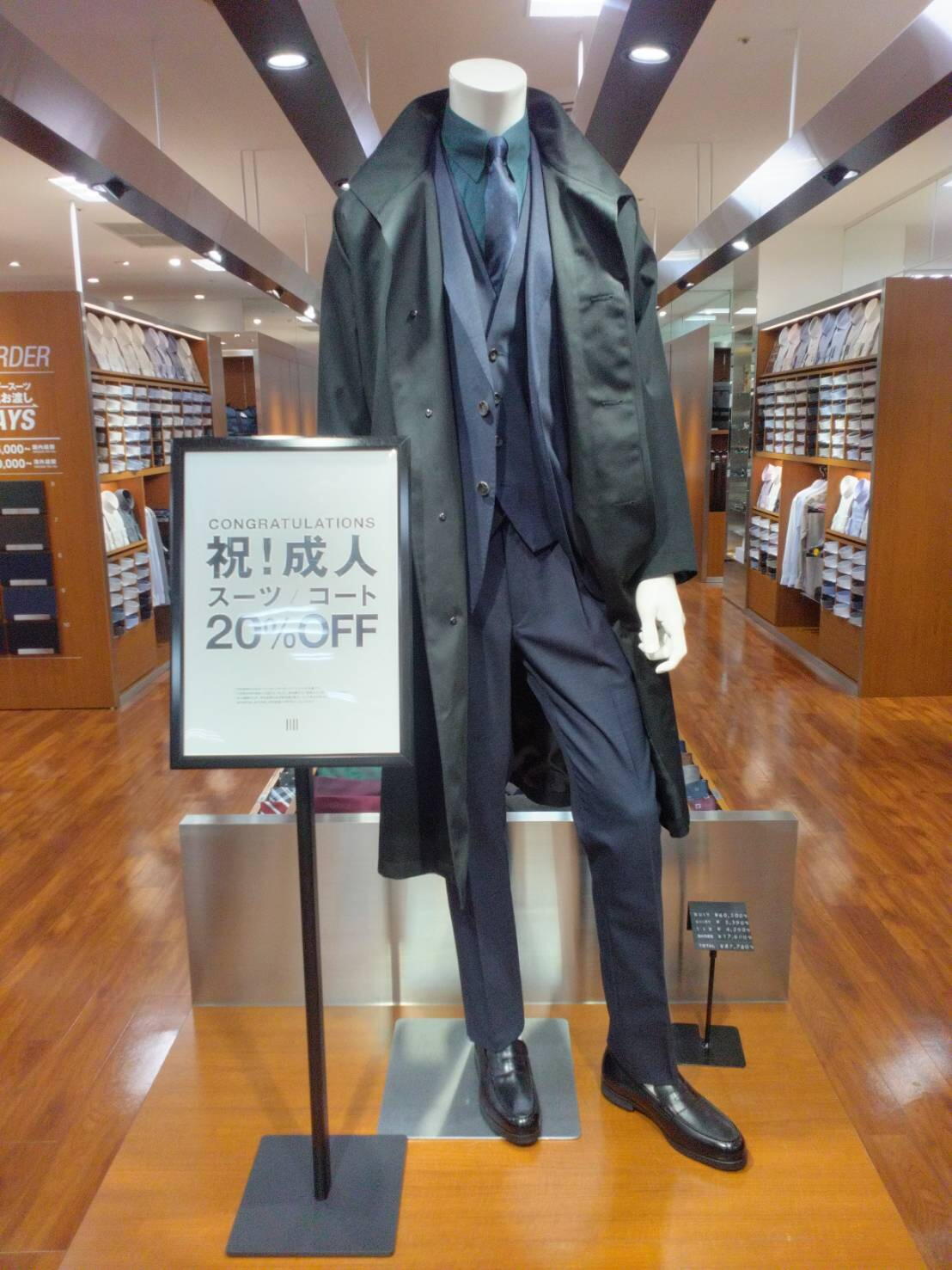 スーツ、コート、パターンオーダースーツが20%オフになるチャンスです。