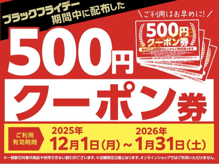 ブラックフライデー期間中に配布しております500円クーポン券のご利用は、12/1(月)〜1/31(土)となっております。ぜひお得にお買い求めください。