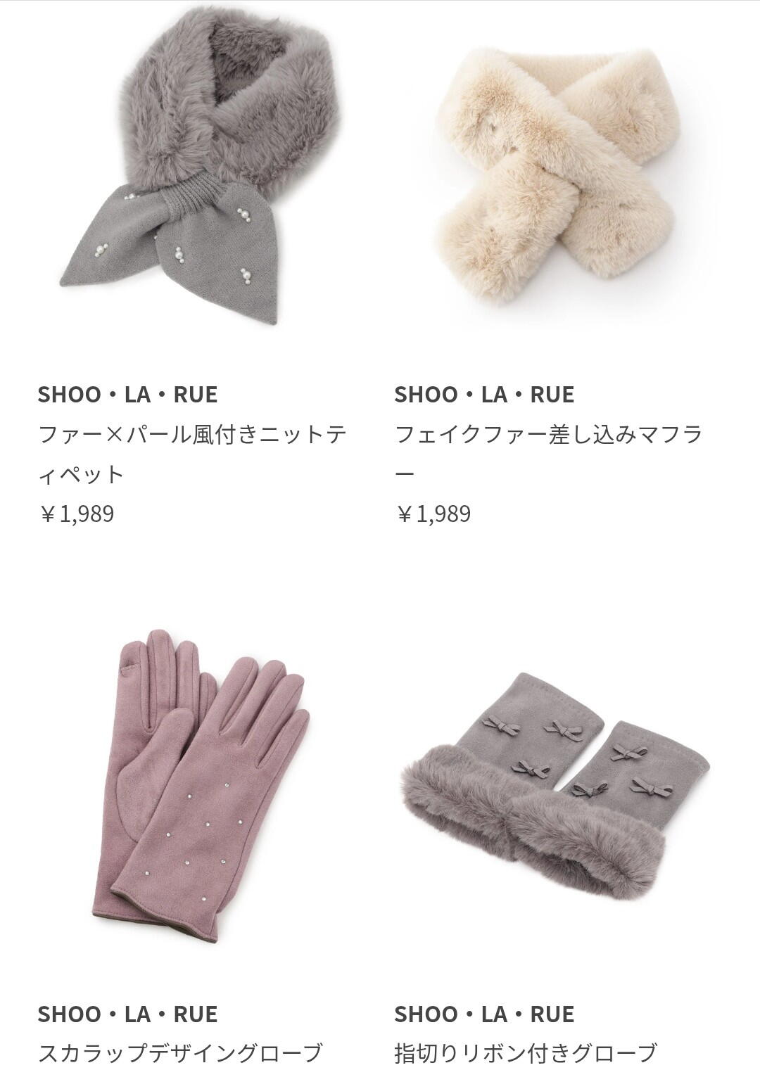 シューラルーでは、雑貨コーナーも定番のふわふわマフラーやファーティペット、キレイ目バックやショルダーバックなど…