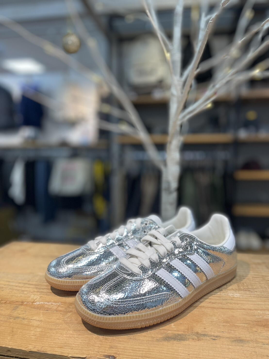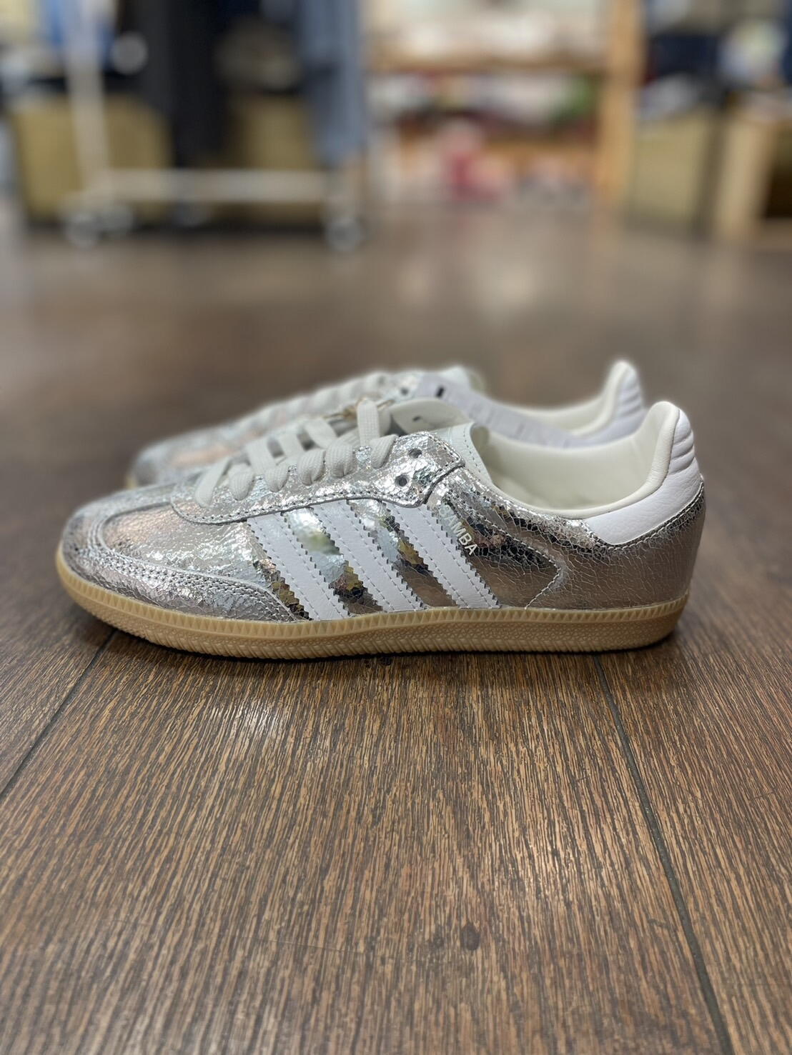 ひび割れたシルバーレザーのアッパーの輝きが個性を放つ、サンバ OG。
