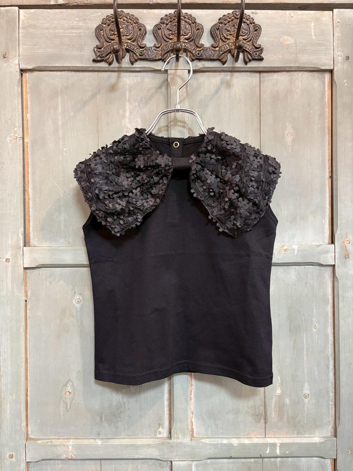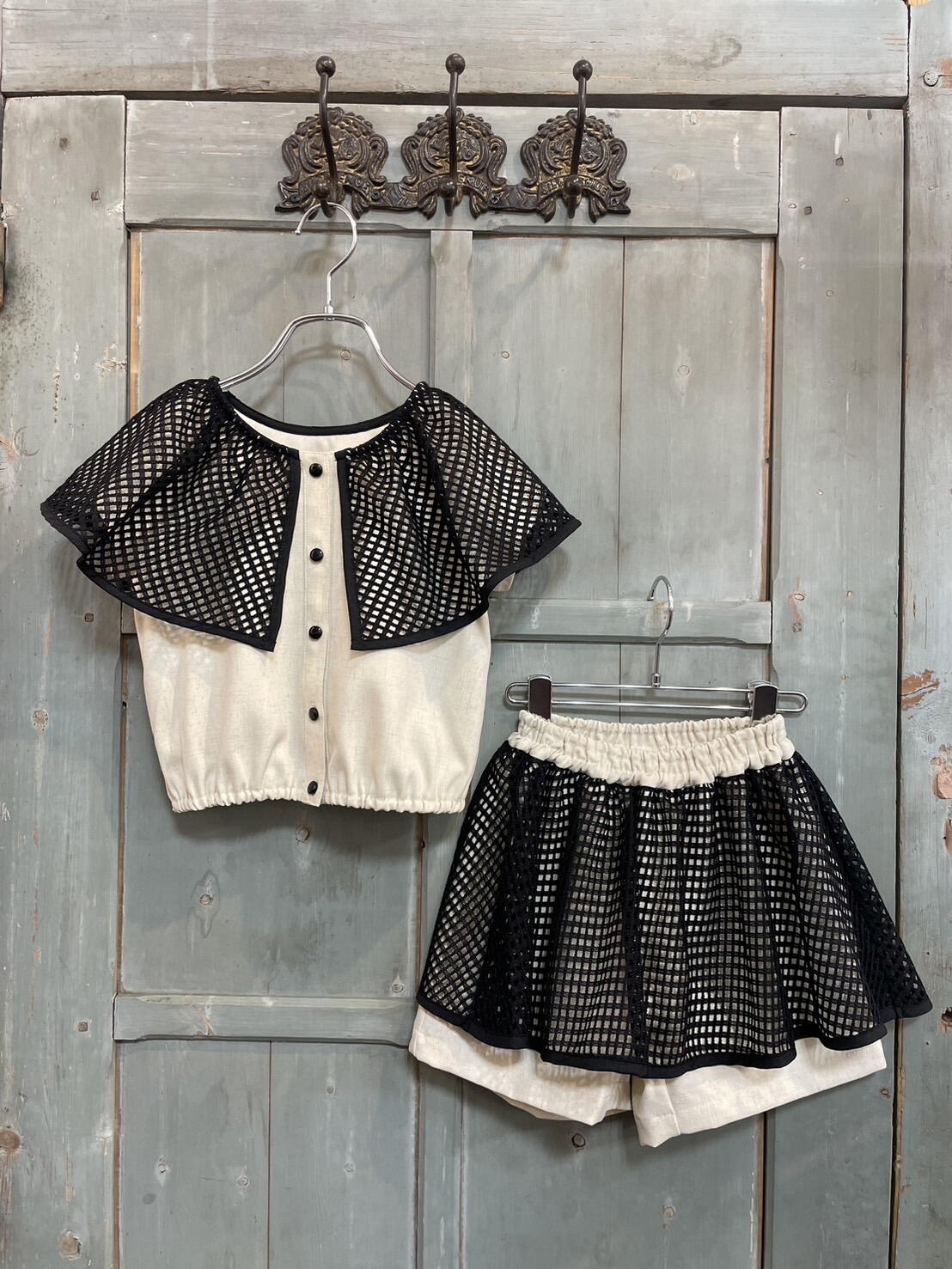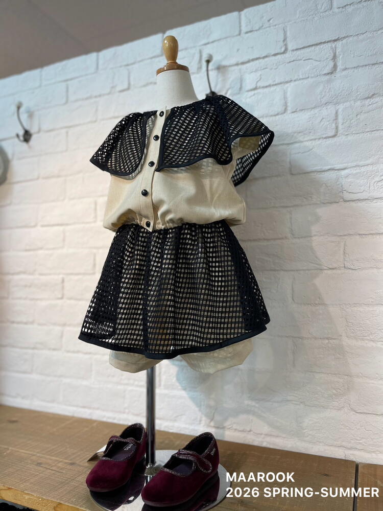 ナチュラルなキナリカラーにブラックのメッシュのケープ衿のコントラストが映えるブラウスです。