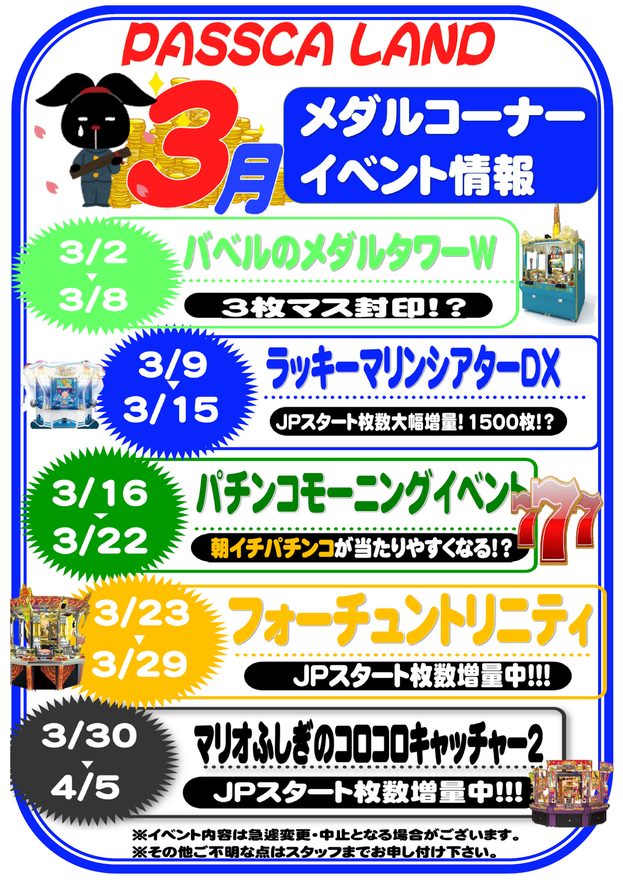 3月のメダルコーナーイベントのご案内です(*^^*)