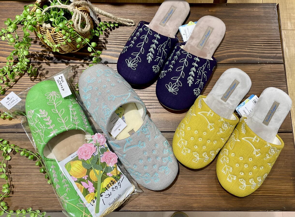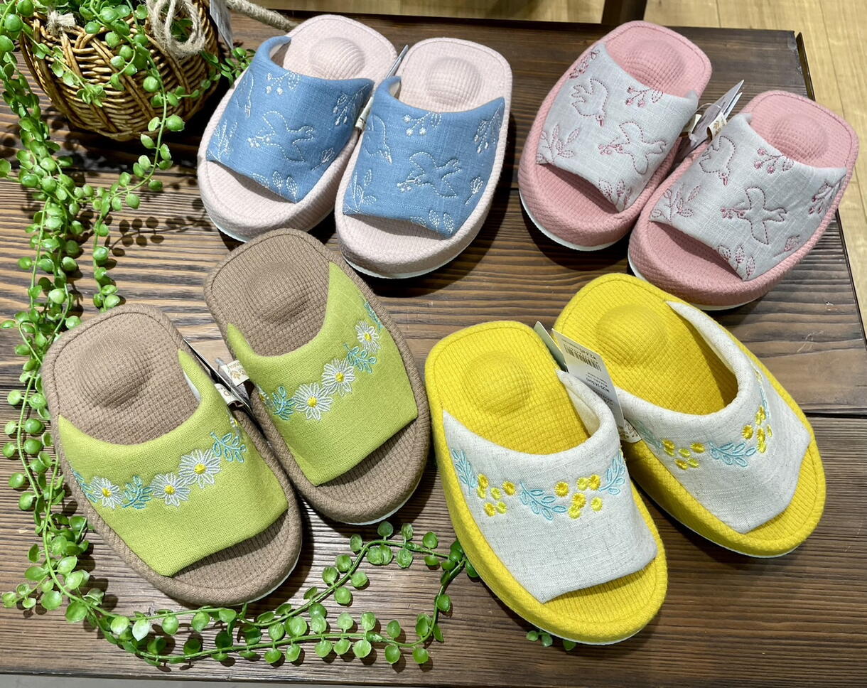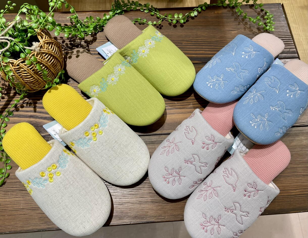 お花や鳥などを刺繍で施した軽量スリッパ。