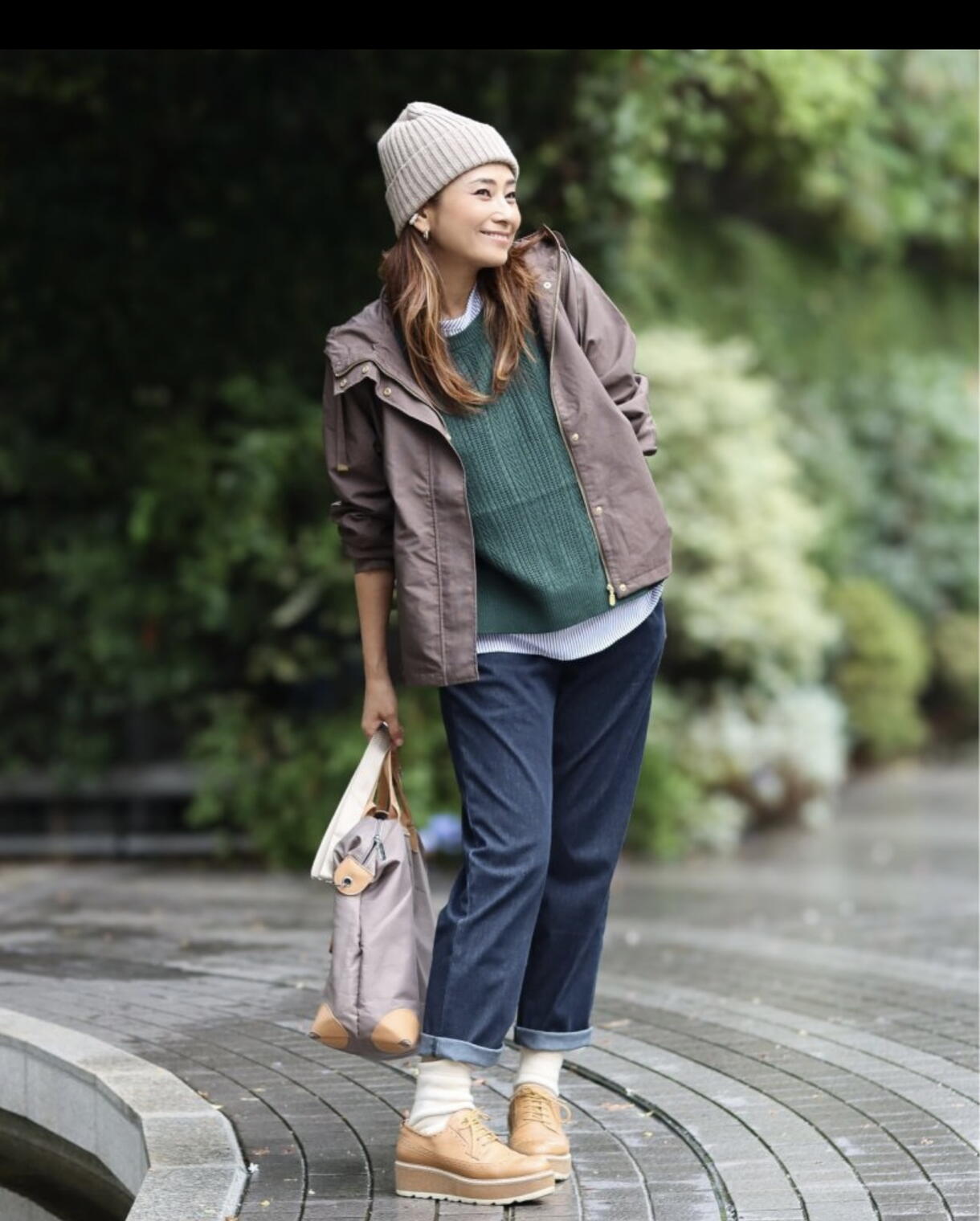 ゴールドパーツの輝きが洗練さを演出する上品なマウンテンパーカーは、ウエストを絞ることでシルエット変化も可能。インには奥行きのあるニットベストブラウスセット、ボトムは縦×横自在に伸縮するikka自慢のGOKU楽パンツをセレクト。バッグはアウターと同系色でリンクさせ、シックな秋の空気に馴染むカジュアルコーデの完成です♪