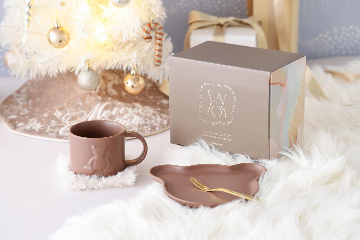 くまのデザインが施されたマグや、プレート、ふわふわしたファーのコースターがかわいらしく、ギフトでもらって嬉しいデザイン!