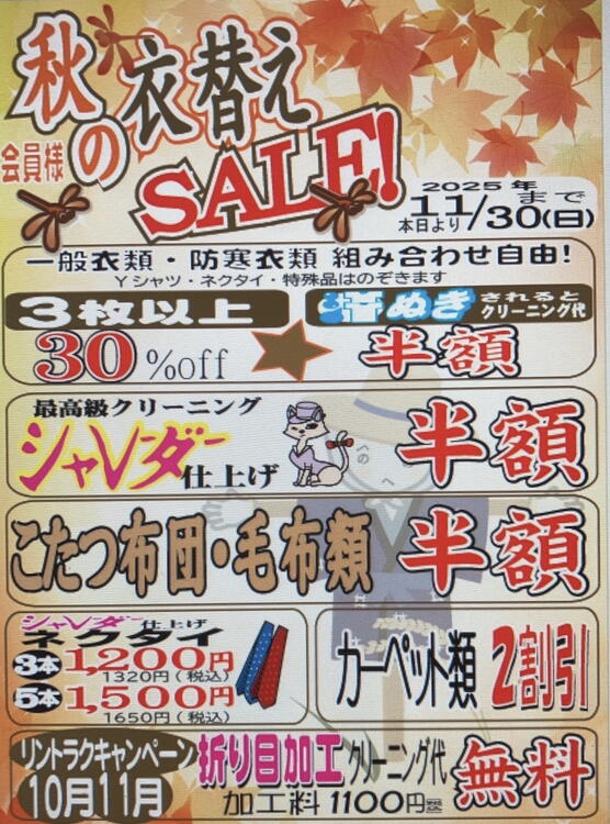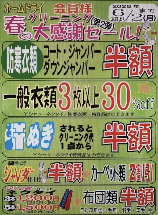 ①ご入会(更新)当日、特殊品は除くクリーニング代半額