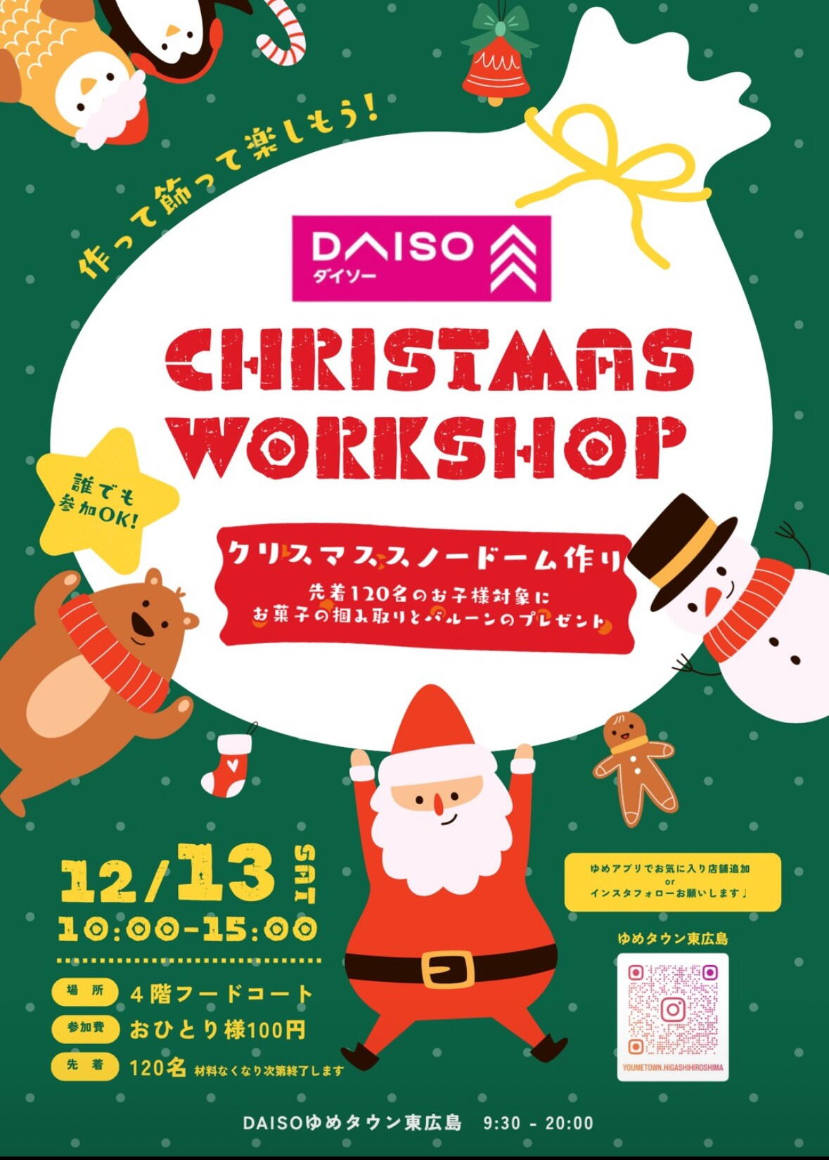 当日の会場にて参加料100円(税込)のお支払いとゆめアプリお気に入り店舗にゆめタウン東広島をお気に入り登録した画面またはゆめタウン東広島インスタグラム公式アカウントをフォローした画面をご提示でご参加いただけます。