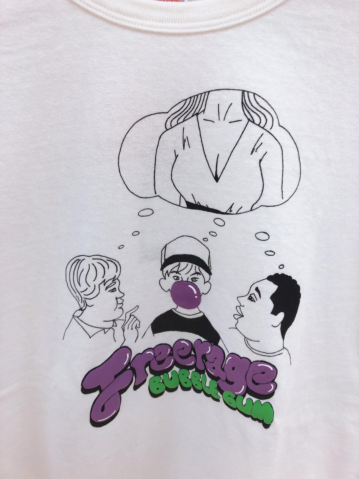 風船ガムのCMからインスパイアされたイラストを落とし込んだ可愛らしいリサイクルコットンTシャツです☆
