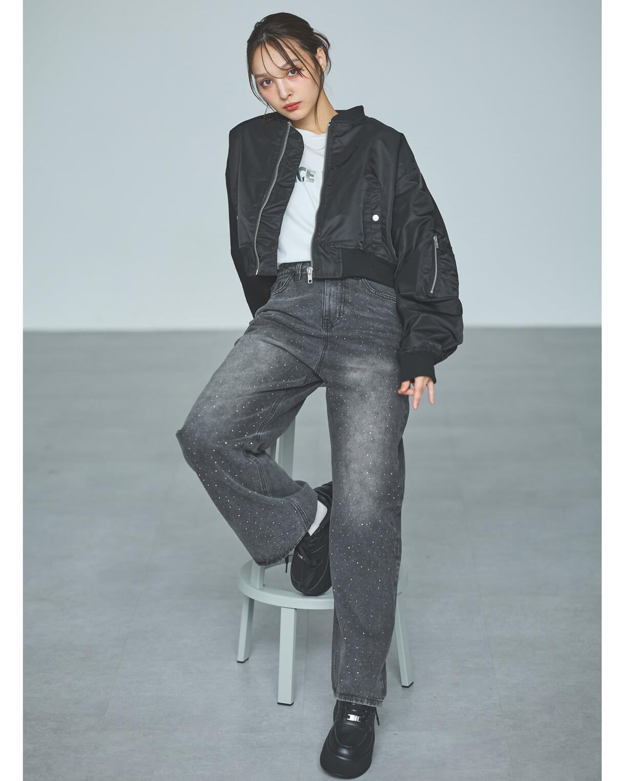 小さなラインストーンを散りばめたデザイン性のあるデニムパンツ。