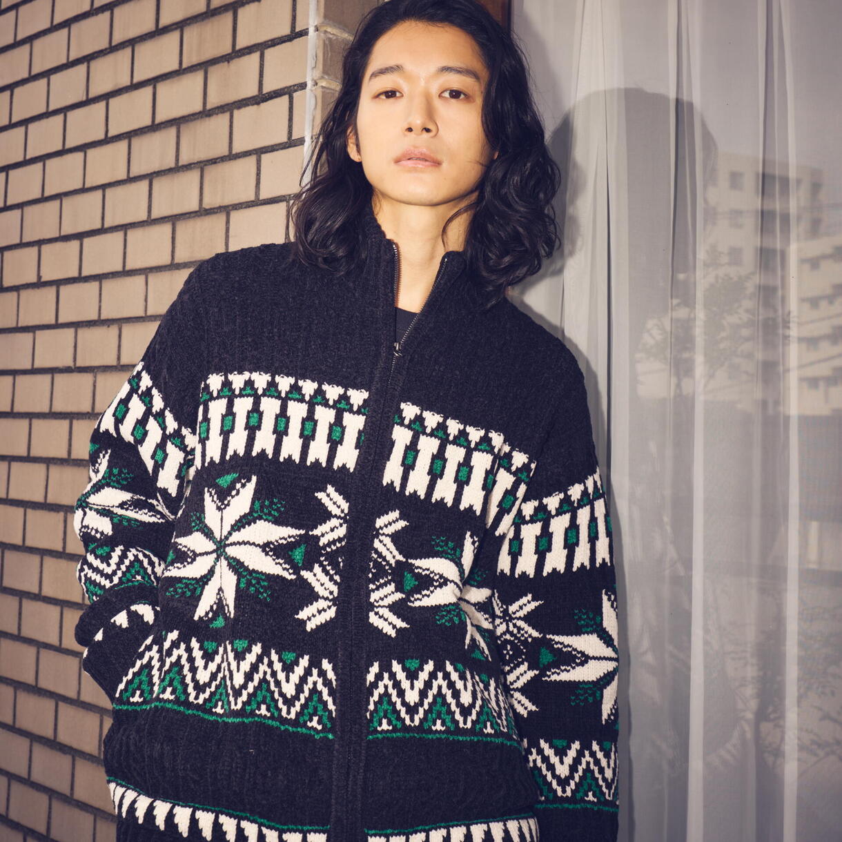 雪の結晶とケーブル柄を組み合わせたモール糸のジャカードニット。