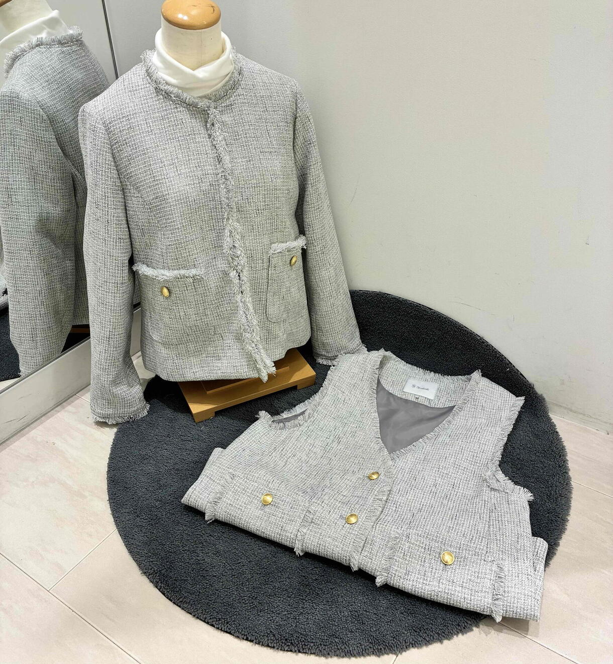 華やかツイード素材で仕上げたノーカラーのショート丈ジャケットが入荷いたしました♪