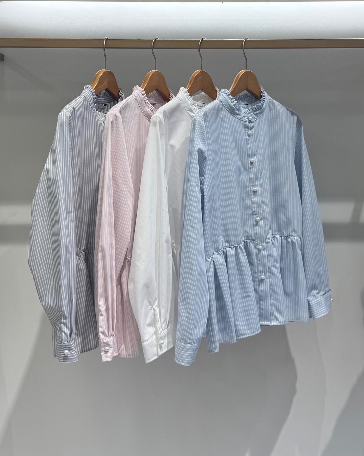 スタンドフリルとパール調ボタンが、顔回りを上品に彩るブラウスが入荷いたしました♪