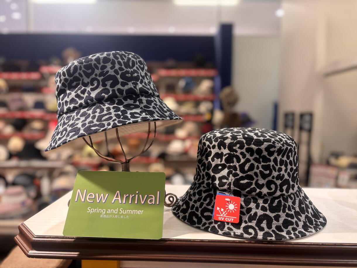 デニム生地でヒョウ柄のハットなど様々な物を取り揃えております♪