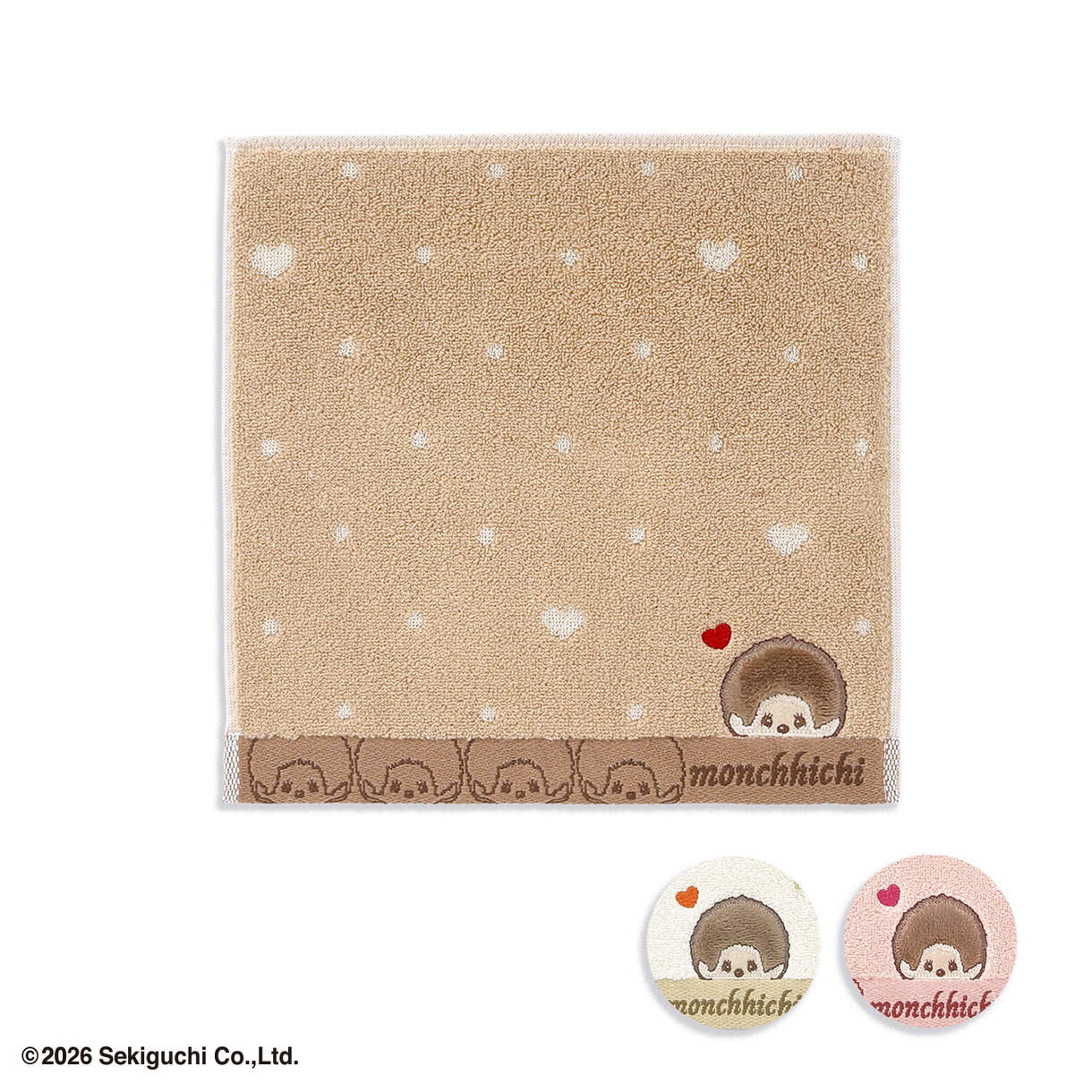 ドット柄の中にそっと忍ばせたハートと、ひょっこり顔をのぞかせるモンチッチの刺繍が、やさしくキュートな印象を添えます。