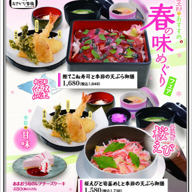 御膳や定食をはじめ、海の幸をぜいたくに使った海鮮丼やヘルシーなお茶漬けが人気です。夜は新鮮な肴でお酒もどうぞ。