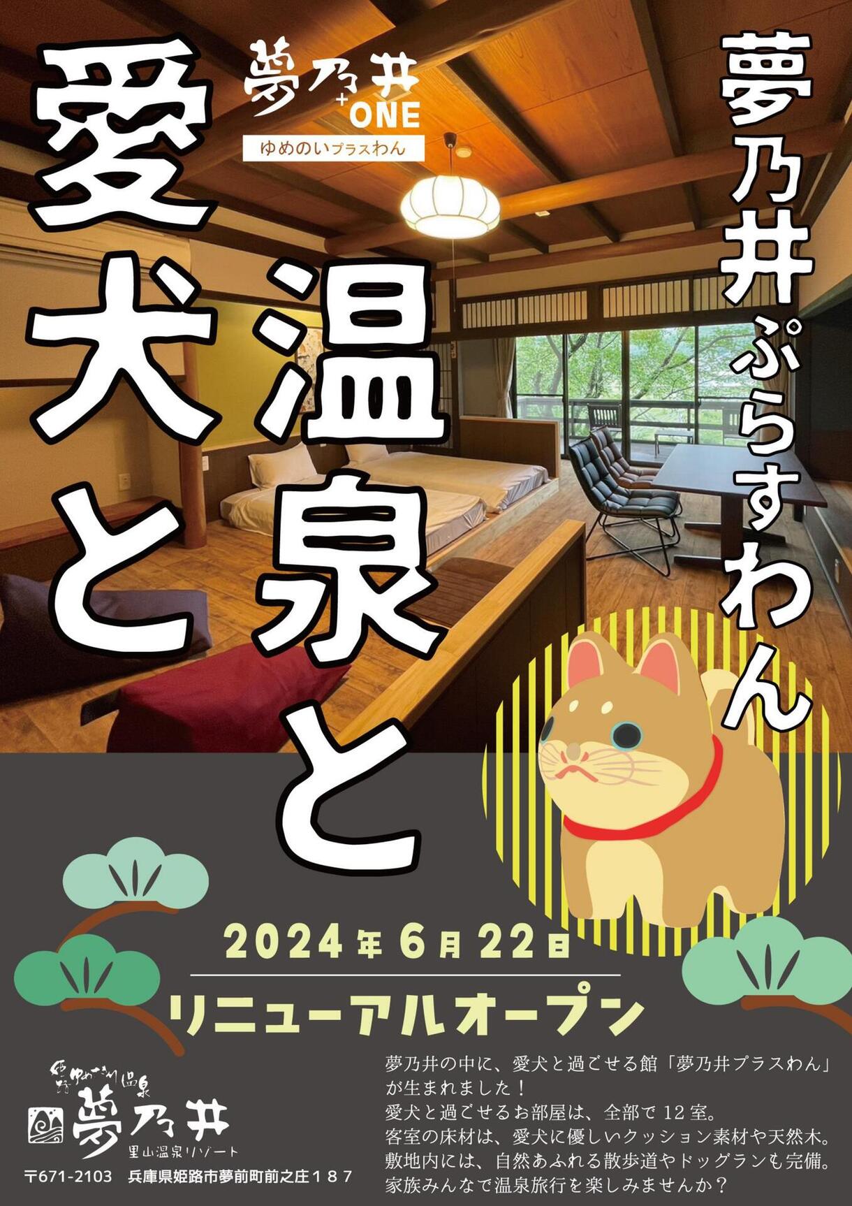 温泉でゆっくりしたいけどワンちゃんのお世話が…という皆様。ご存じ塩田「ゆめさき温泉夢乃井」にワンちゃんと一緒に過ごせるお部屋が登場しました。お部屋のタイプは3タイプ全12室、お好みに応じてお選びいただけます。敷地内には散歩道やドッグランも完備。ご家族と愛犬とみんな一緒に温泉旅行を楽しみませんか?