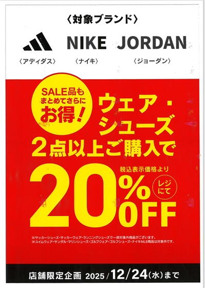 【アディダス・ナイキ・ジョーダン】ウェア/シューズ2点以上購入で税込表示価格より20%OFF