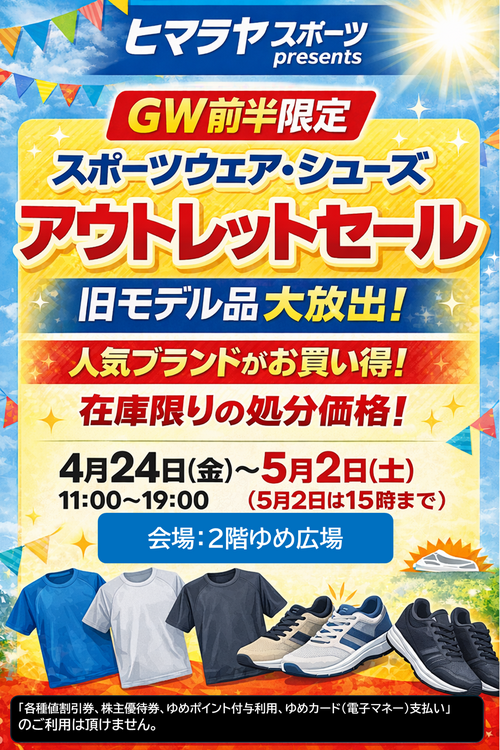 ゆめタウン2階のゆめ広場にて、ヒマラヤのGW企画アウトレットセールを開催します。