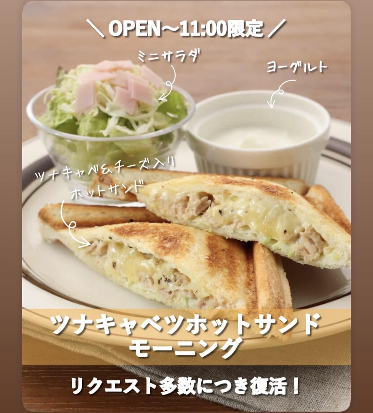 モーニングでは復活を希望されるお声も多く、この度リクエストにお応えして「ツナキャベツホットサンド」が帰って参りました!
