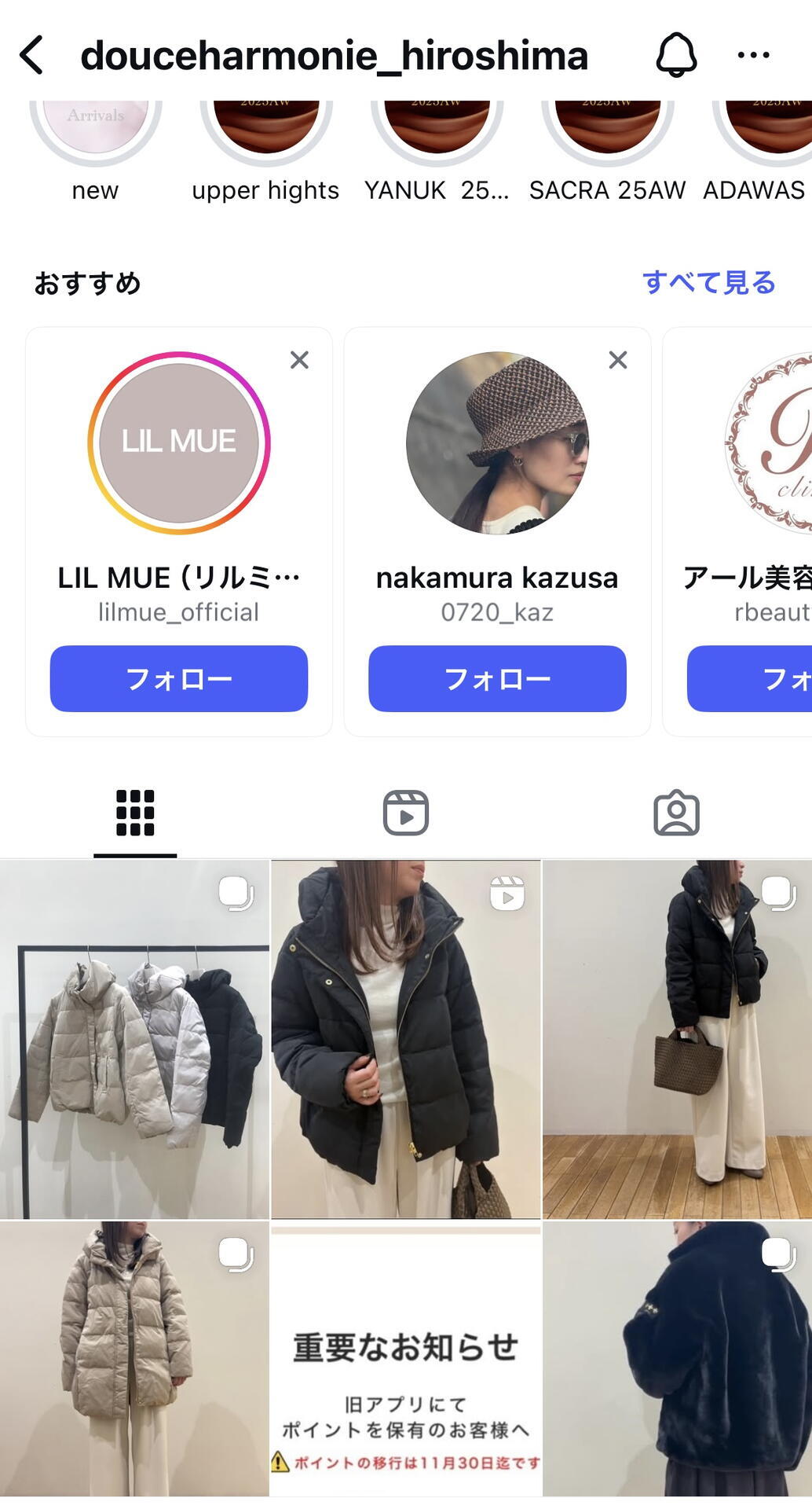 ドゥスハルモニ広島店では新作入荷のご案内やお得なイベント情報をInstagramやLINEで発信しています。