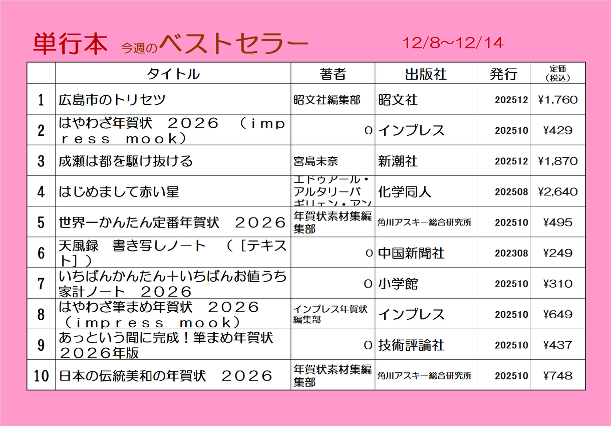 紀伊國屋書店ゆめタウン広島店の先週の売上ランキングを発表します!