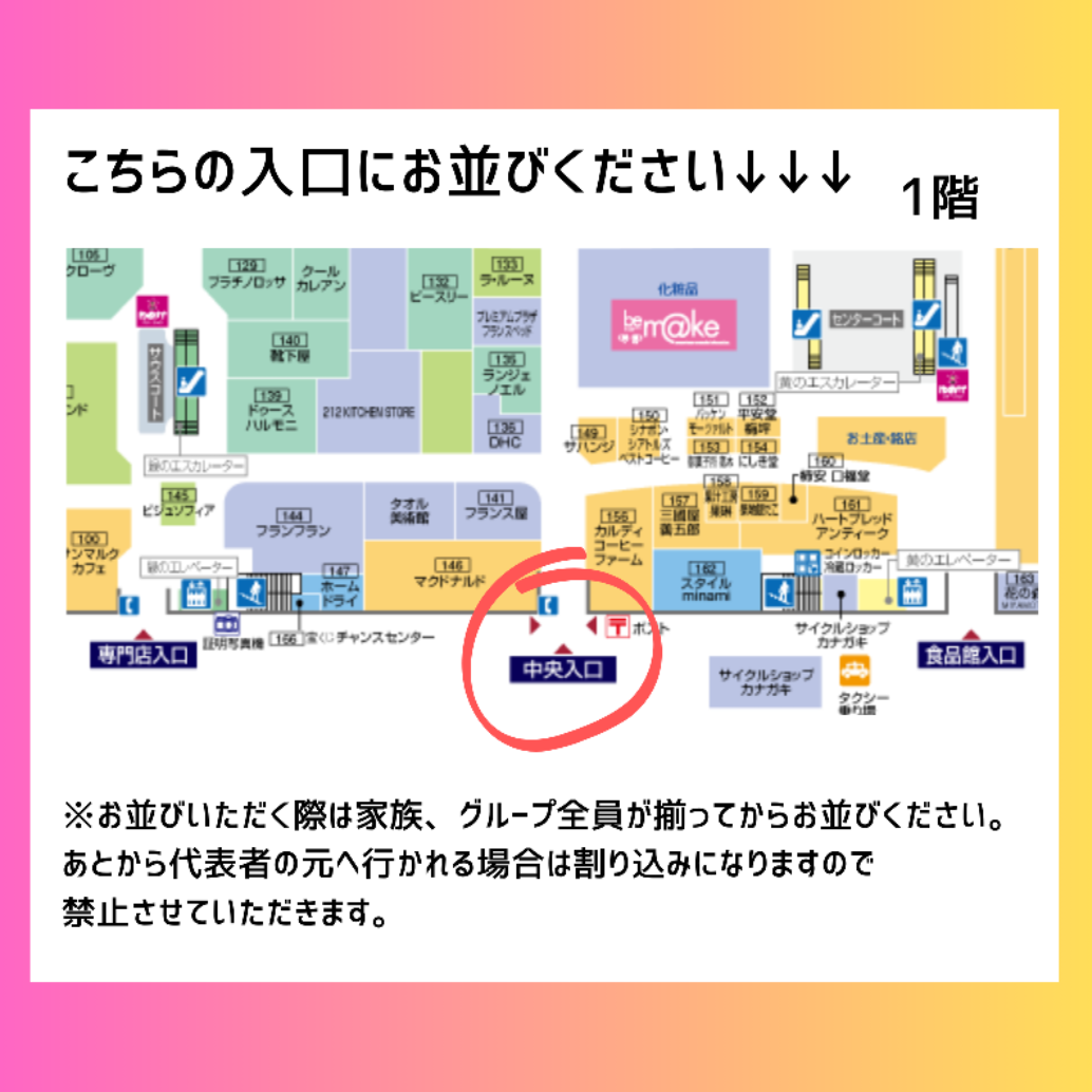 ※中央入口以外からお店に来られたお客様には整理券の配布はございませんので