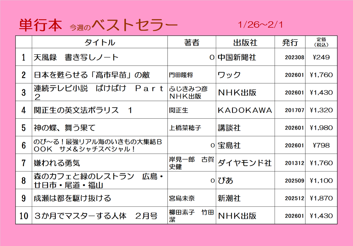 紀伊國屋書店ゆめタウン広島店の先週の売上ランキングを発表します!