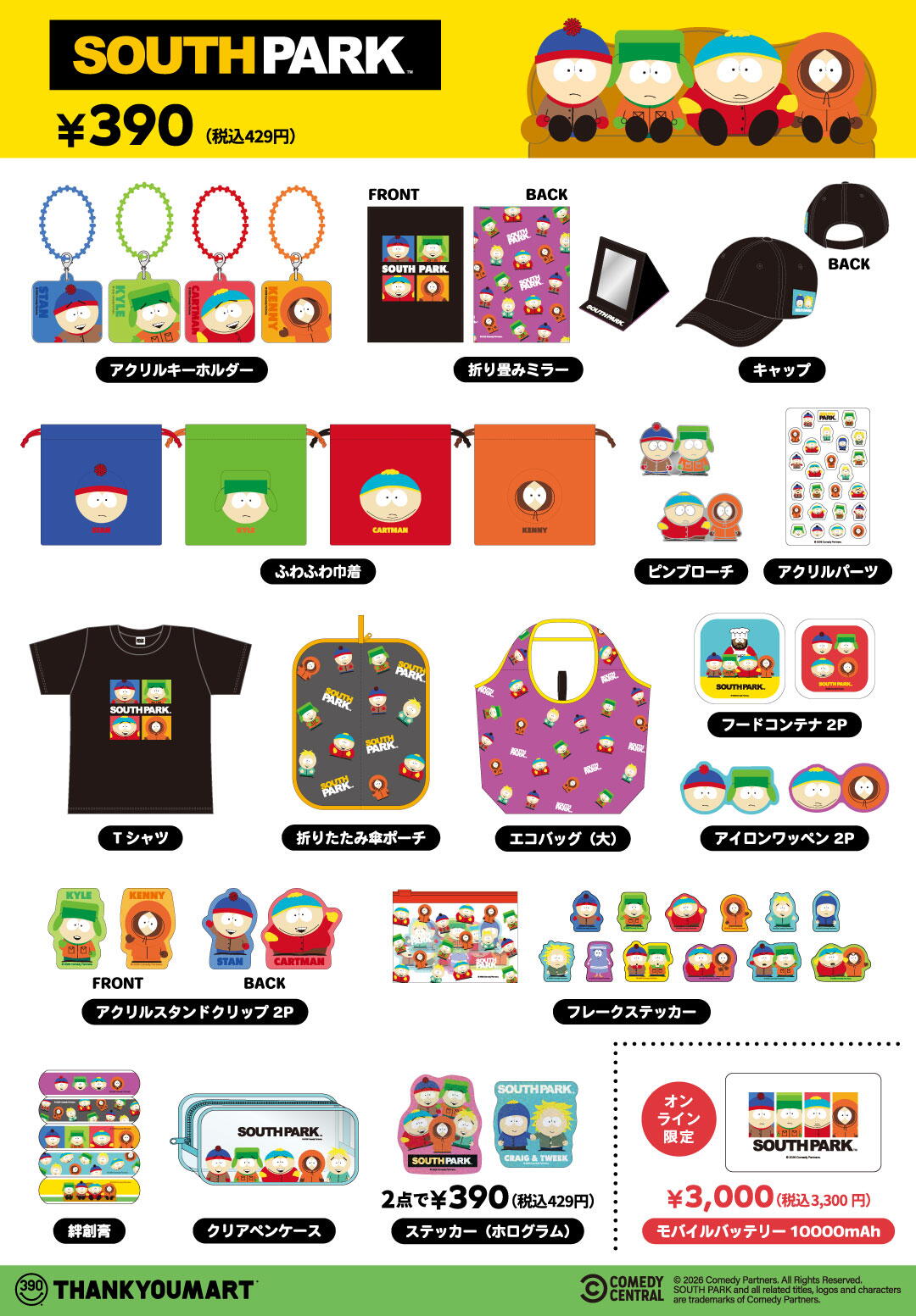 「サウスパーク」との コラボ雑貨が新登場! ポップでキャッチーなデザインの デイリー使いしやすい 全 25 アイテムをラインナップ! 手に入るのはサンキューマートだけ◎ 是非、サンキューマート店舗でチェックしてみてください! 【店頭販売】 ■販売開始日:2026 年 2 月 27 日(金)より、店舗毎・アイテム毎に入荷次第販売 ■商品詳細 :https://thankyoumart.jp/collections/southpark ※ご来店のタイミングにより在庫状況が異なります。あらかじめご了承ください。