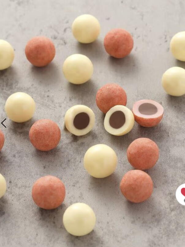 ミルクチョコレートの上からストロベリーチョコレートをコーティングし、さらにいちごパウダーを振りかけたストロベリー味の2種類の味を愉しめます。