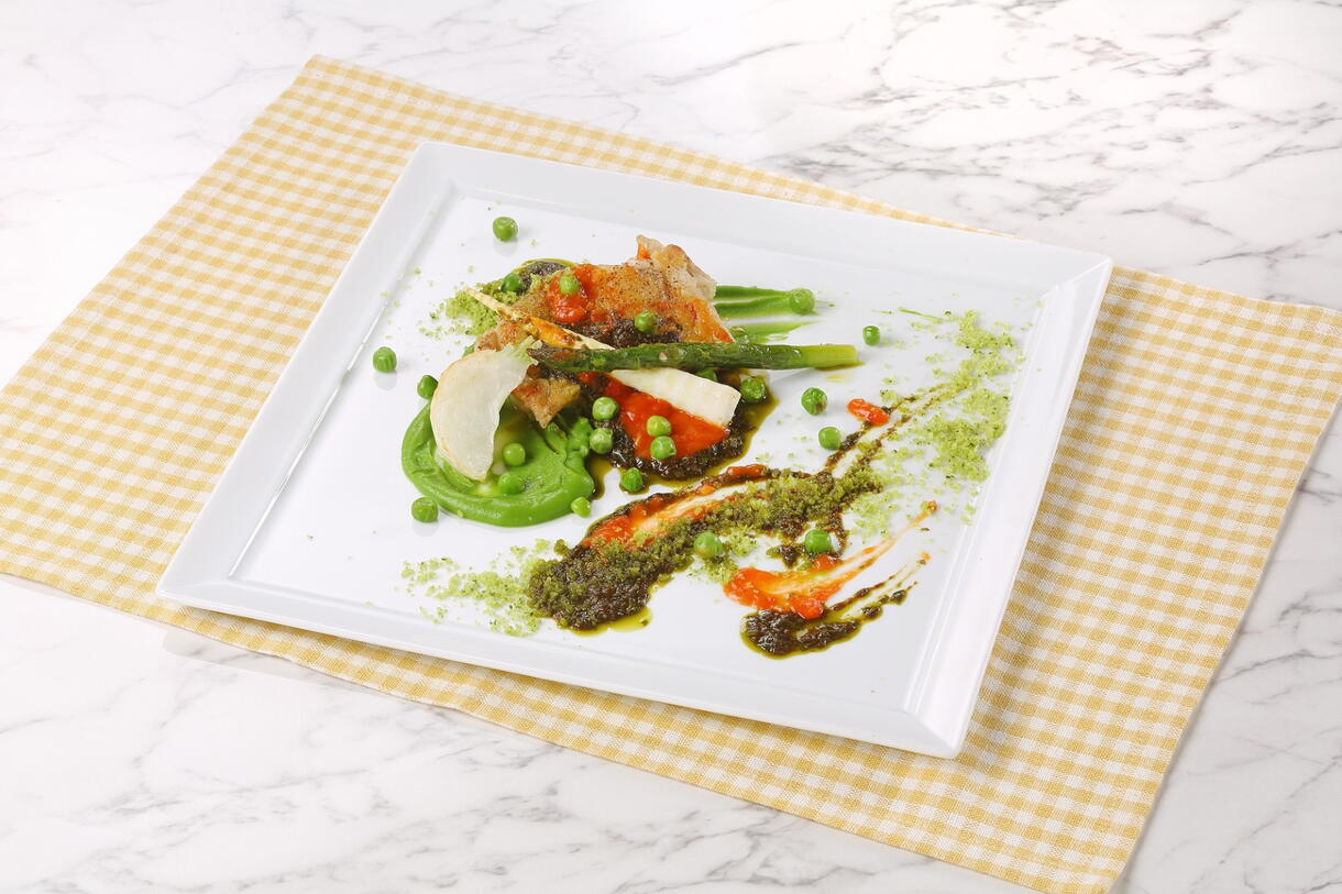 パリッと焼けた香ばしいチキンを色鮮やかなソースで仕上げました。