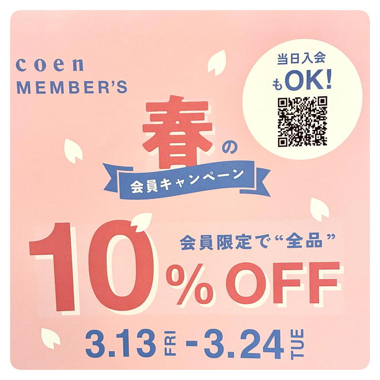 当日入会OK!『coen MEMBER'S 会員様限定10%OFFキャンペーン♪』スタート!