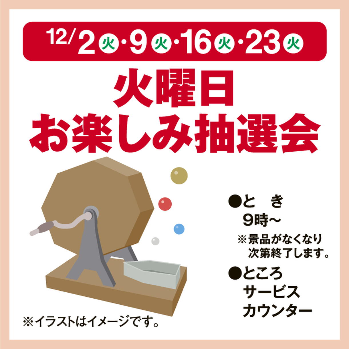 ※12/30(火)の火曜ガラポン抽選会はお休みさせていただきます。 1月は1/6(火)から開催を予定しております。
