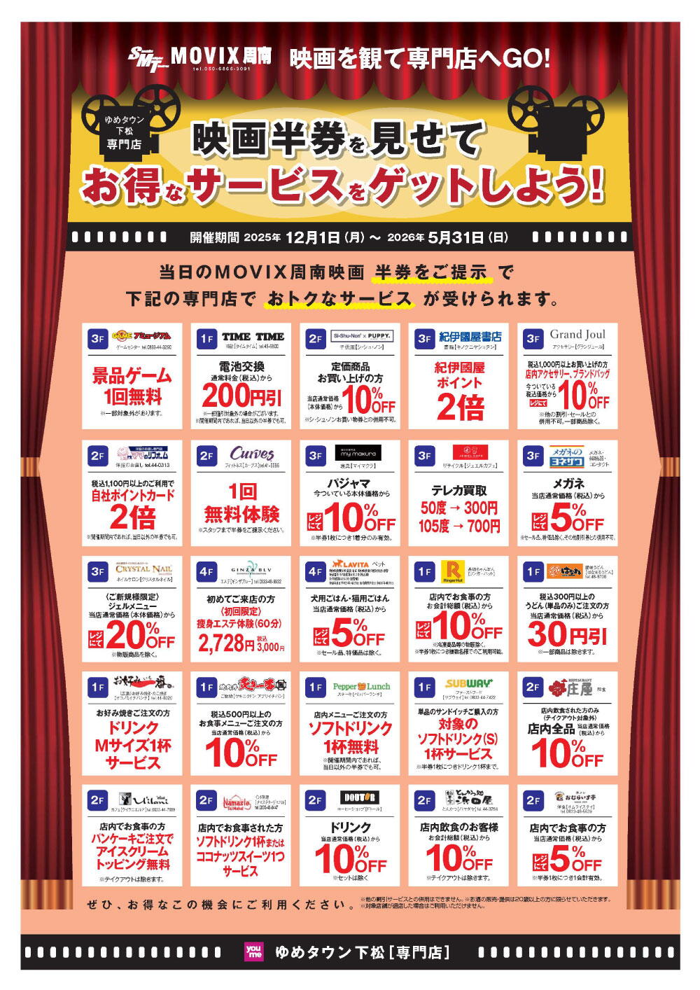 当日のMOVIX周南の映画の半券をご提示で専門店のお得なサービスが受けられます。
