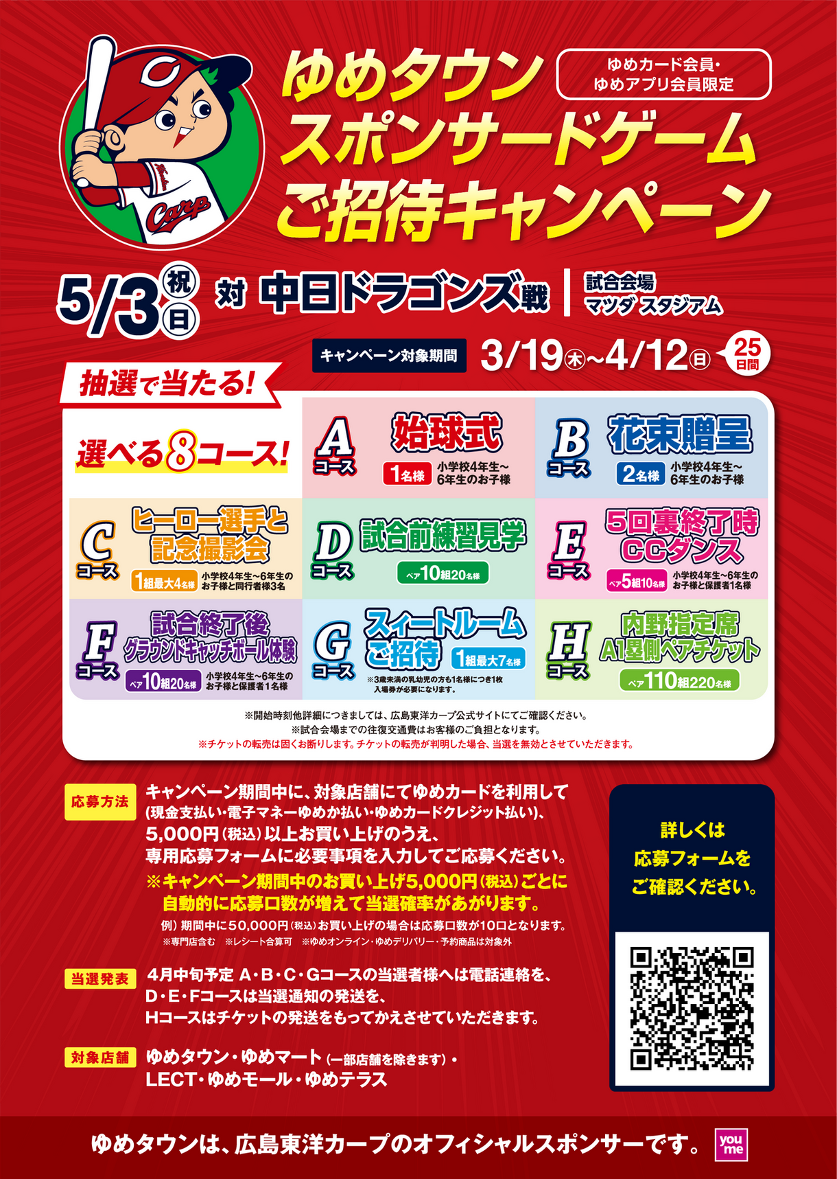 抽選で「広島東洋カープ」ゆめタウンスポンサードゲームにご招待します。