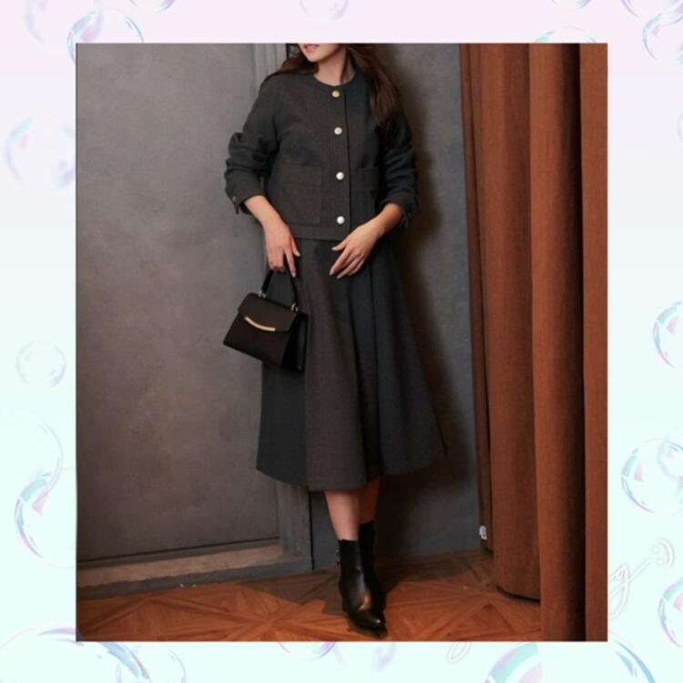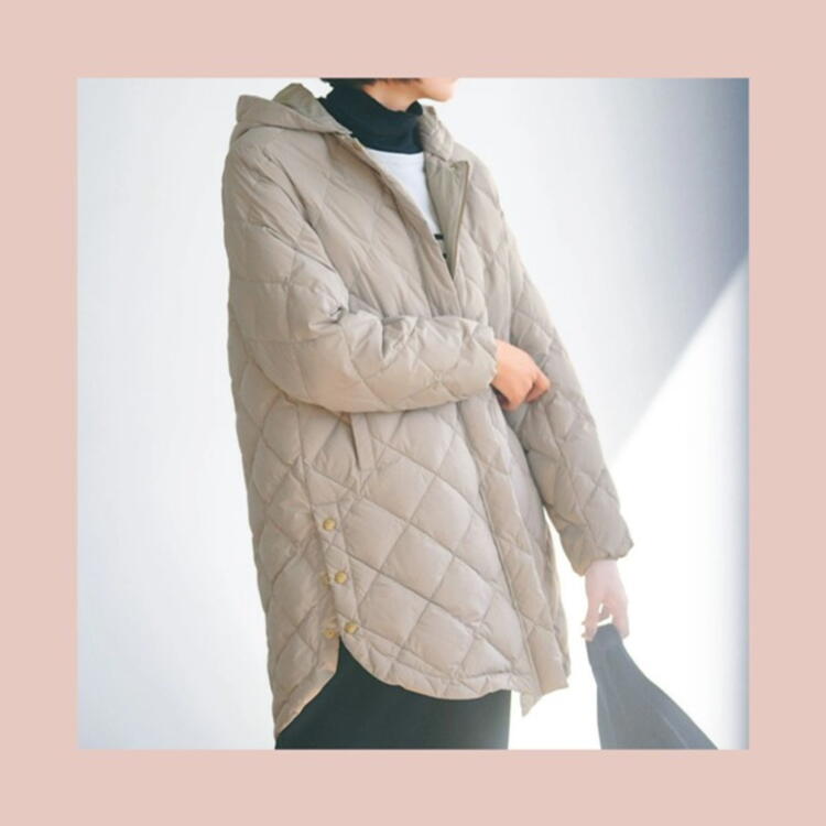 首に沿うような上品な襟元で、ややコクーンシルエットになっていて、ヒップが隠れる丈感です。