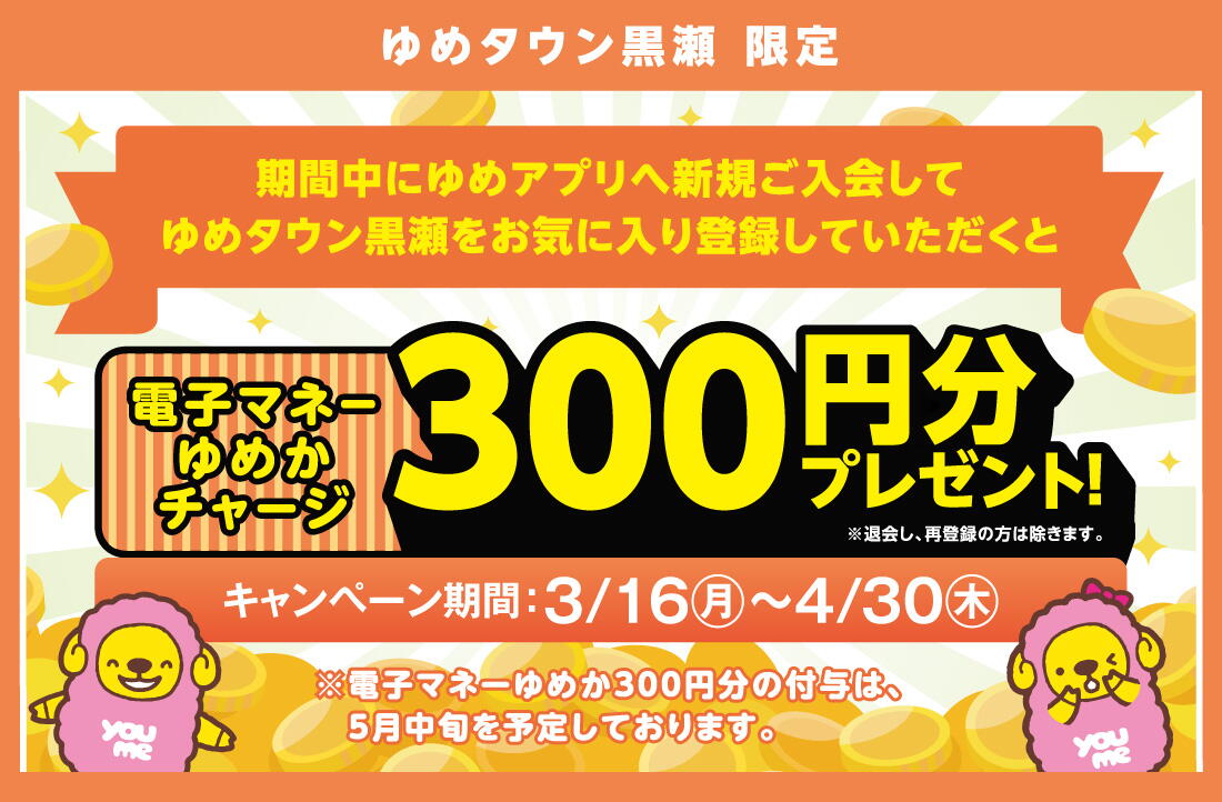 【ゆめアプリ新規入会】+【ゆめタウン黒瀬をお気に入り登録】で電子マネーゆめかチャージ300円分プレゼント!