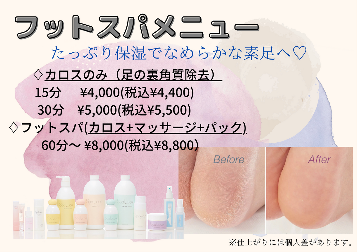 ★足裏角質除去→マッサージ→保湿トリートメントパック付き………¥8,000(税込み¥8,800)