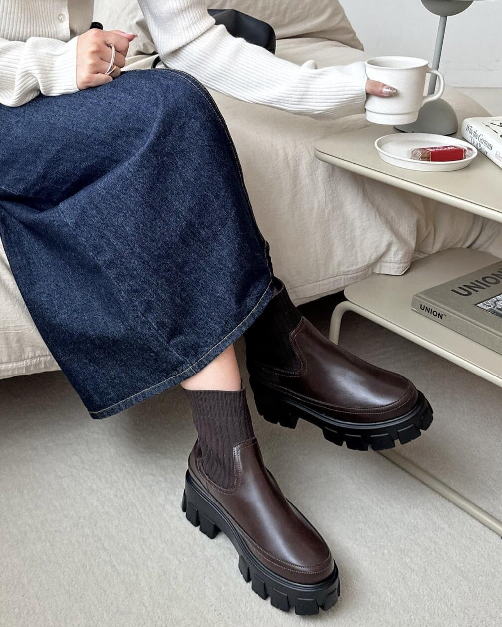 ボリュームのあるトラックソールが目を引くソックスブーツ。足首周りはフィット感のあるリブニットを使用していて、足にしっかり馴染みながらもスッキリ見せてくれます!